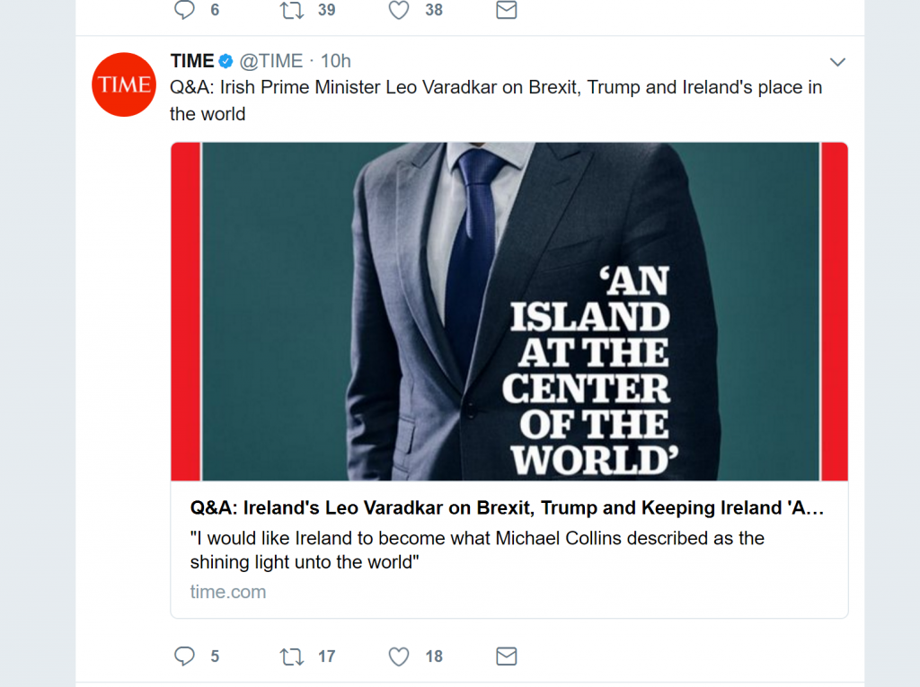 This week Leo Varadkar is on the cover of Time magazine, looking like the generic leader of…well, take your pick of any country. The Time cover doesn’t give you many clues. The pithy headline reads “An Island at the Centre of the World”. Evoking a sense of Irish exceptionalism on the one hand and national dissolution on the other. What is rare is beautiful, so the saying goes. But little about modern Ireland, good or bad, seems rare or novel. Indeed the Time magazine headline tips the reader off in advance that Ireland is everywhere and nowhere.